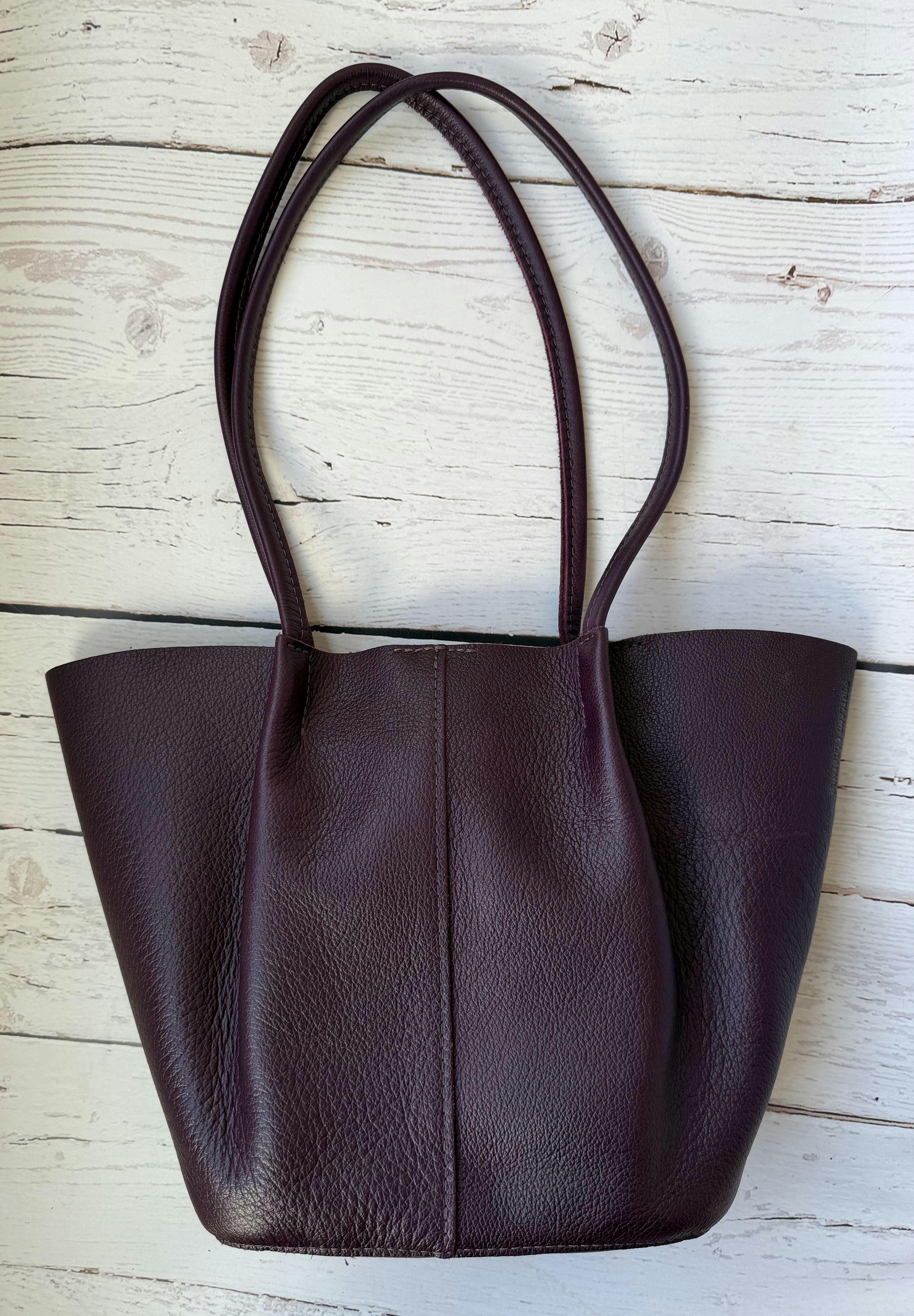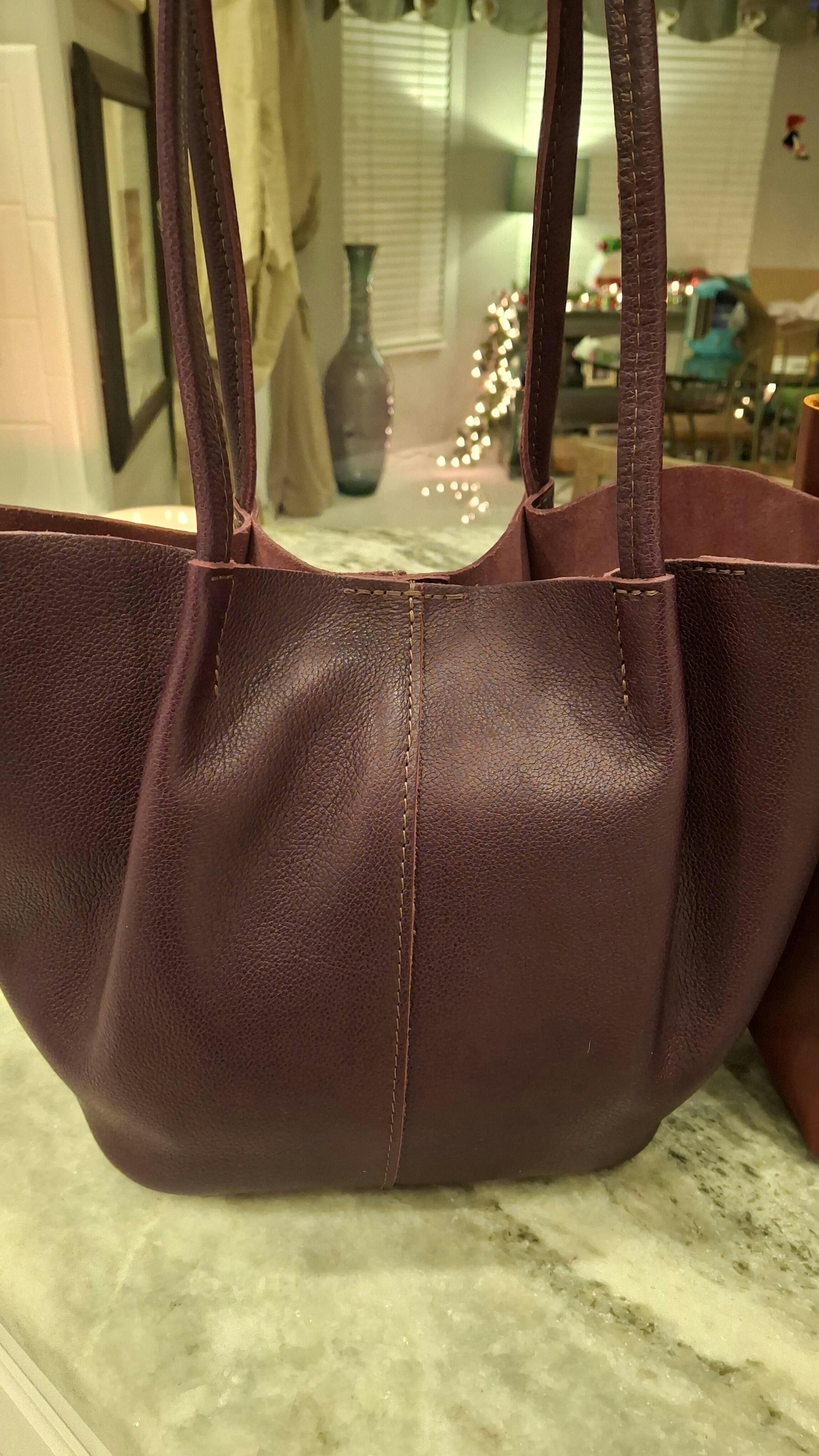 Holy cow! Literally…this bag is such a beauty. I love the design with the gentle holds of leather, the easy shoulder carry and the interior pocket. this is large enough to hold a small purse and extras or just all the regular purse things. The plum leather is beautifully pebbled and so supple.