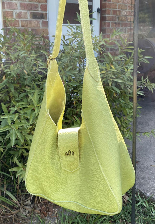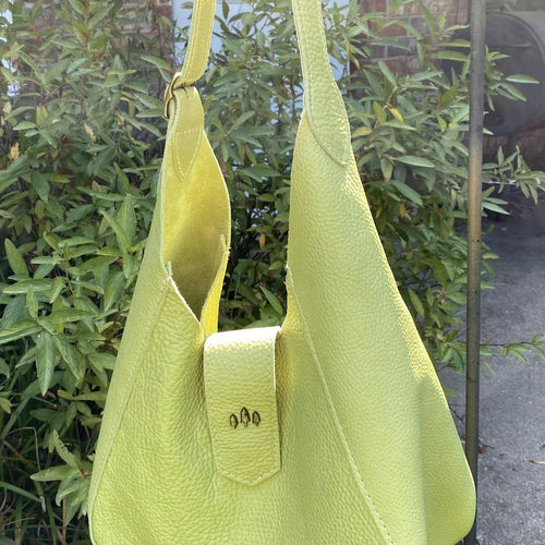 Hello Yellow | Model wearing structured hobo shoulder bag with adjustable strap and magnetic closure