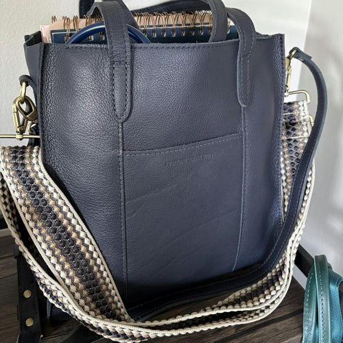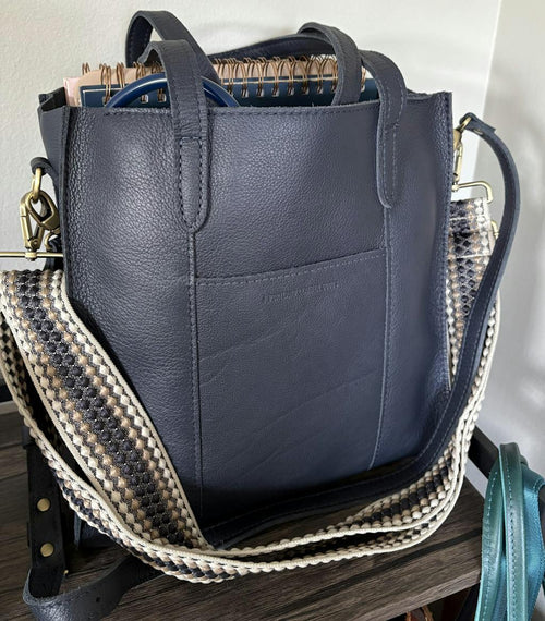 Astro Blue*Classic | Large leather tote bag with sturdy bridle handles and front pocket