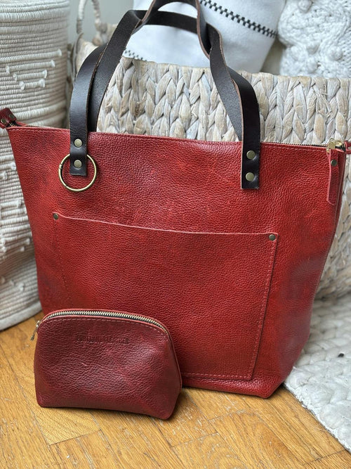 Our full-grain leather is the strongest and most durable available, and the unique texture and natural imperfections from the cow's life have not been sanded, cut or shaved off. Full-grain is SIX times stronger than Buffed, Upholstery or Genuine leather. Please note that our pebbled leather, like all of our leather, is a natural product. You may notice changes in grain or texture throughout your bag.
