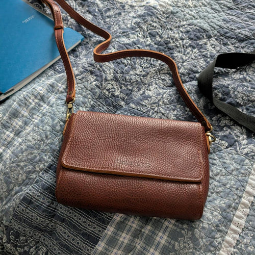 Love this little cross body mini Metro in Grizzly. Very close in size to the new Parker (Parker has divider pouches where Metro has one big open space with a small inside pocket and is a tad bit larger and more of a chubby rectangle than a skinny rectangle) Metro lays East/West on body versus Parker laying North/South on body. The Grizzly color is elegant for formal or rugged depending on occasion. I was not a brown fan but now I have a Coldbrew Festival and this mini Metro in Grizzly and the color reminds me of a Hershey chocolate bar. It really is the perfect brown… pebbled or smooth.