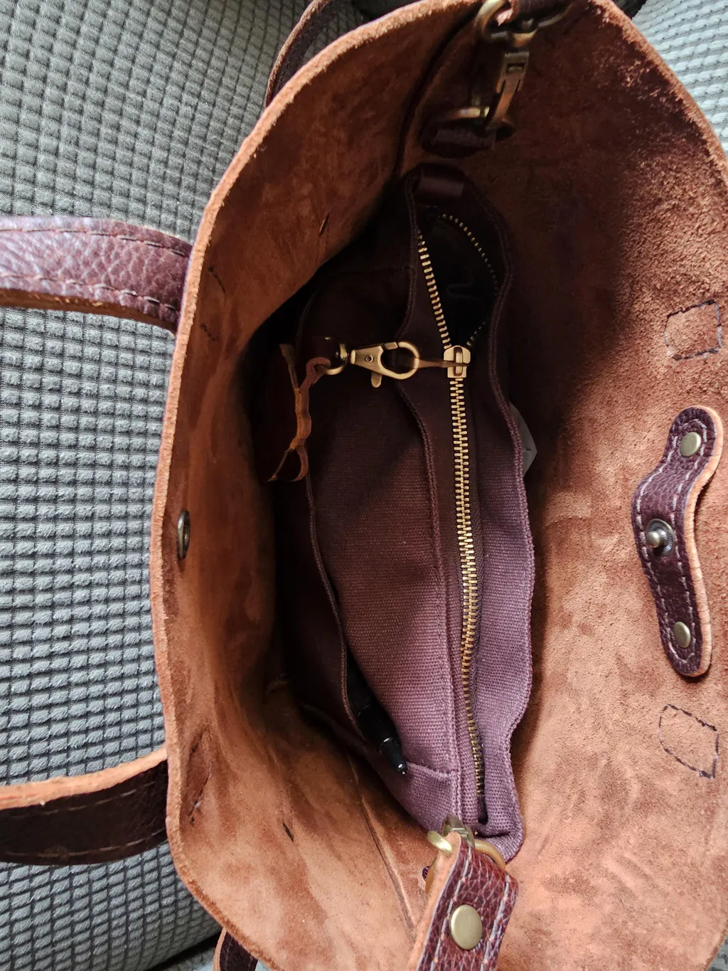 Our durable leather goods are unlined, featuring the natural suede side of the hide. Since fabric-lined bags inevitably discolor and tear with use, we chose to showcase the soft sueded underside of our hides, ensuring that your bag lasts a lifetime.