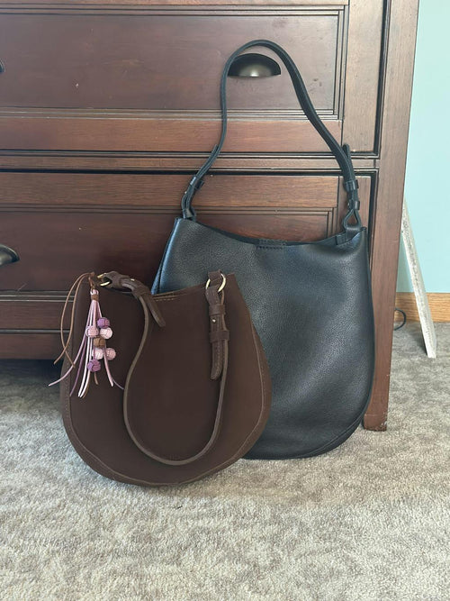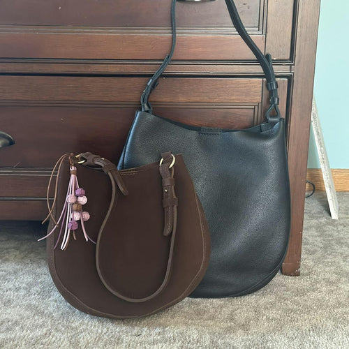 The large Olivia is absolutely my purse peace! It’s the perfect size for me. I love a big bag for my EDC because I often take my knitting and/or my Kindle with me, and I need the extra room. It has a huge pocket inside, a key loop, and adjustable straps. I use it as a shoulder bag (my favorite type of bag) but I know some people have switched the straps to make it a crossbody. I love the options! I have it in Coldbrew and Pebbled Black, and the pebbling has just the right amount of slouch and structure. I want to try the Medium size at some point; I just need to decide what color!