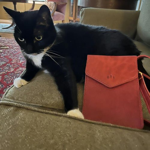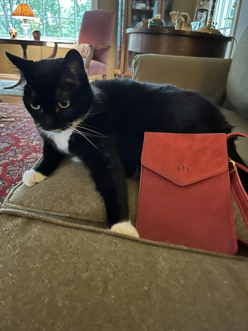 Parker Bag in Chili Red! What could be more perfect?! It’s just the right size for my I-phone, small wallet, and keys for a walk in the park with my corgis. (my cat loved it too). I purchased an AP bag but, as with other AP items I’ve bought, it looks perfect to me-great size, rich red color, beautiful pebbles and fabulous leather smell.