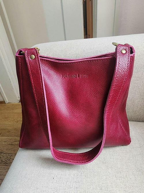 LOVE my Triangle bag in Berry Good! Perfect dark pink without being too bright. Smooth, firm leather that holds the triangle shape wonderfully. The bag is sleek enough to be chic and classy, but roomy enough to hold everything I need! I love having both an interior and exterior pocket. The gold hardware rings for the straps is an extra touch of elegance. My new favorite bag!