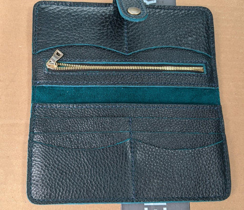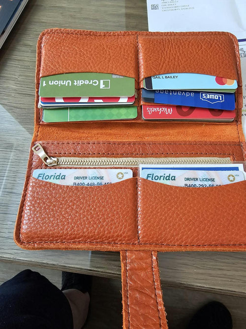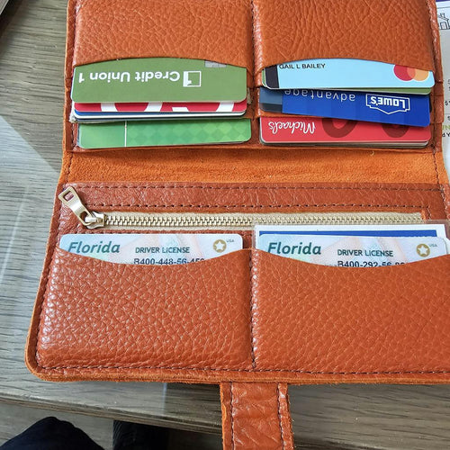 • Features a secure snap closure with 8 card slots and a zippered interior pocket