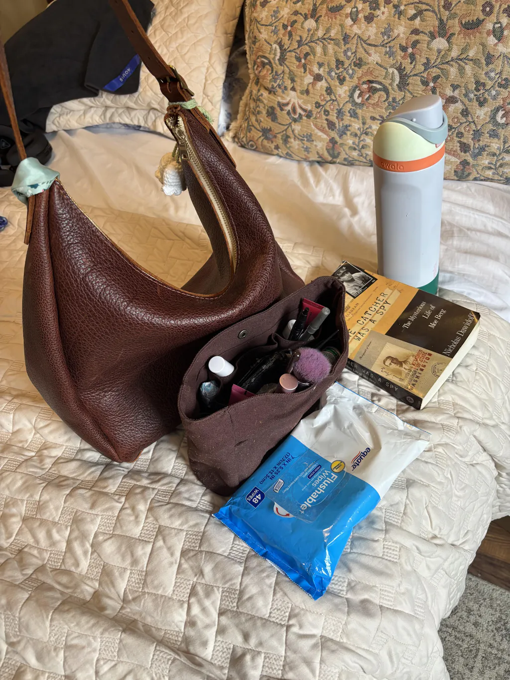I have the medium Aspen in cold brew and absolutely love it. Its simple design makes it a go to bag for any outfit. And its spacious interior easily accommodates everything I carry. I included a photo from a recent trip. The water bottle actually fits in this bag with my kindle, phone, large bifold wallet and several other items. I can zip the bag closed with the bottle fully inside.