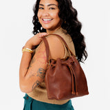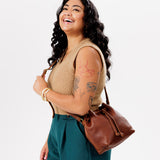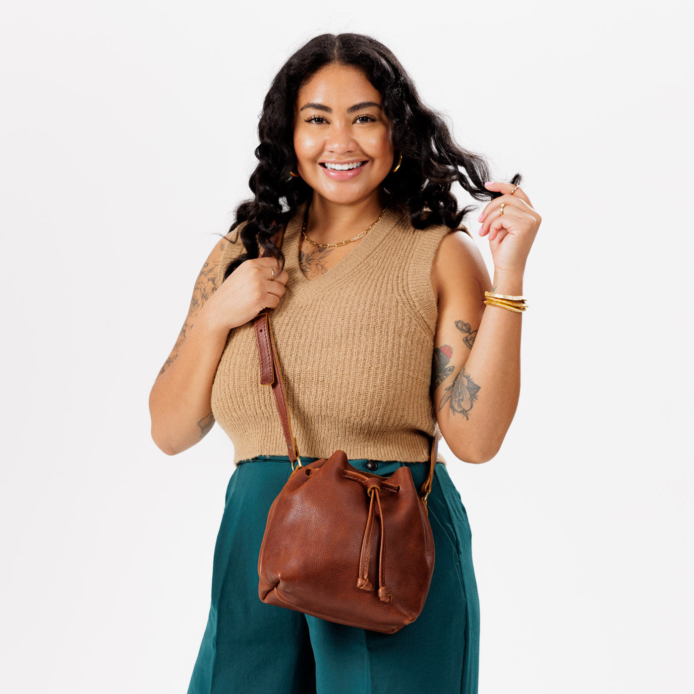 You guys. This bag is EVERYTHING. I was intimidated at first about the small size, but it holds so much! Inside I can fit my small Bozeman wallet, taco tassel pouch, Lovebug plus, small Luna pouch, mini daisy, and my phone and keys! I absolutely love how easy the bucket bag is to use! You can wear it crossbody or on your shoulder, it’s easy to reach right into for your phone or wallet, and it’s simply adorable. The leather smells lovely and the Coldbrew color is rich, soft, and pebbly. I am very seriously considering getting a large bucket, honestly the best purse!