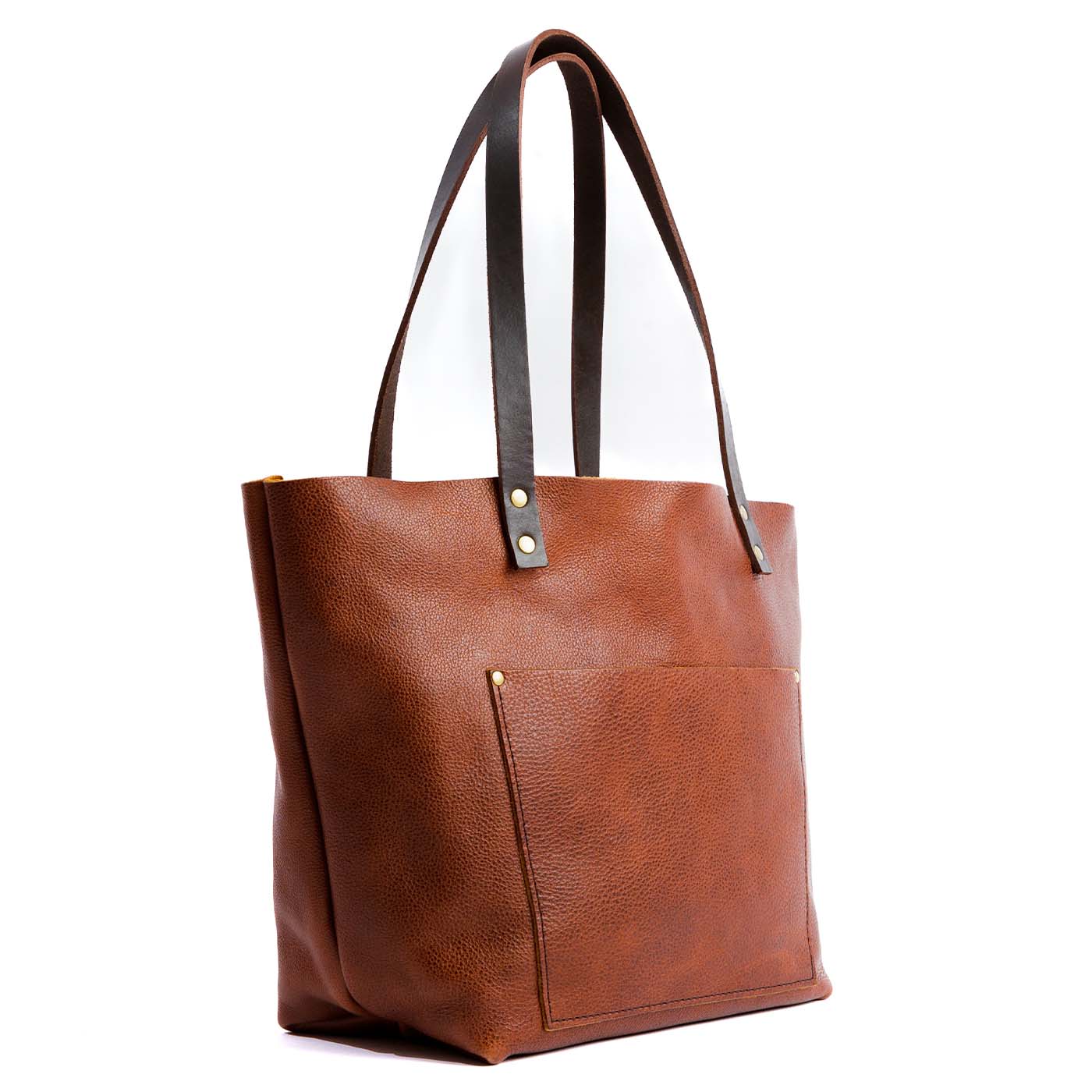 FULL-GRAIN LEATHER: Our leather is the highest quality full-grain chap and English bridle leather available. We only use hides as a byproduct of the beef industry, we like to think that we're helping to minimize waste by using hides that may otherwise be wasted. This kind of leather will never look flawless, as it hasn't been covered in any kind of plastic coating. Don’t worry about keeping the tote perfect - the best part about 100% full-grain leather is that it just gets better with age.