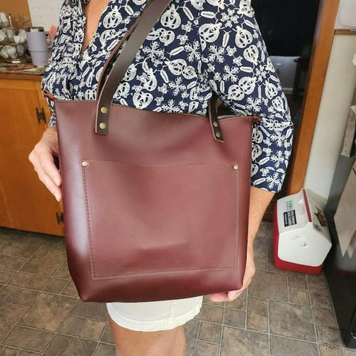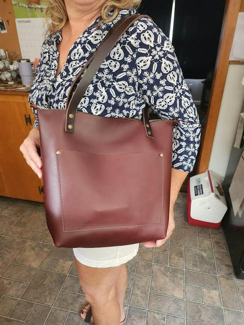 Nutmeg*Zipper | Model holding large zipper leather tote bag with sturdy bridle handles and front pocket