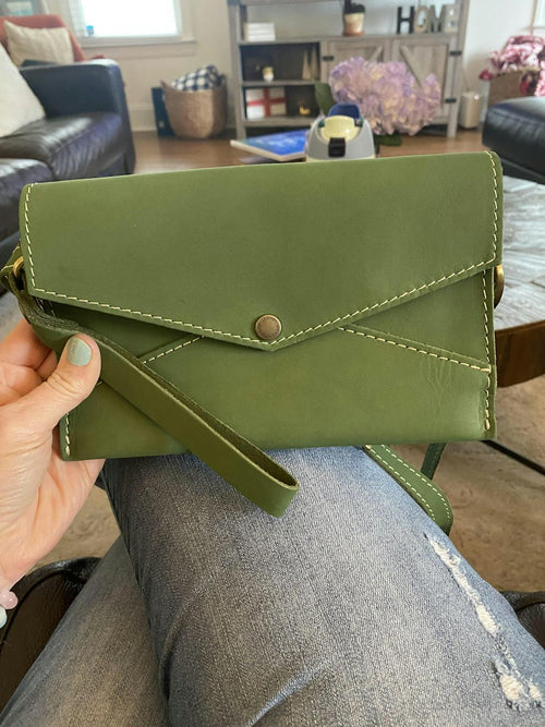 This is such a beautiful leather and the green of succulent is so vibrant. This is probably the most versatile bag. Great cross body for the airport or fancy wristlet for an evening out.
