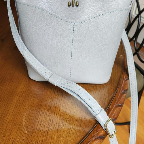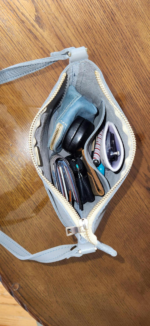 Love it! The size is perfect and fits my wallet, 2 pair of glasses, phone and 2 small pouches. The Nimbus is so neutral it goes with everything 🩵