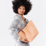 Mamey*Large | Model holding wide bucket shaped tote bag with matching leather handles