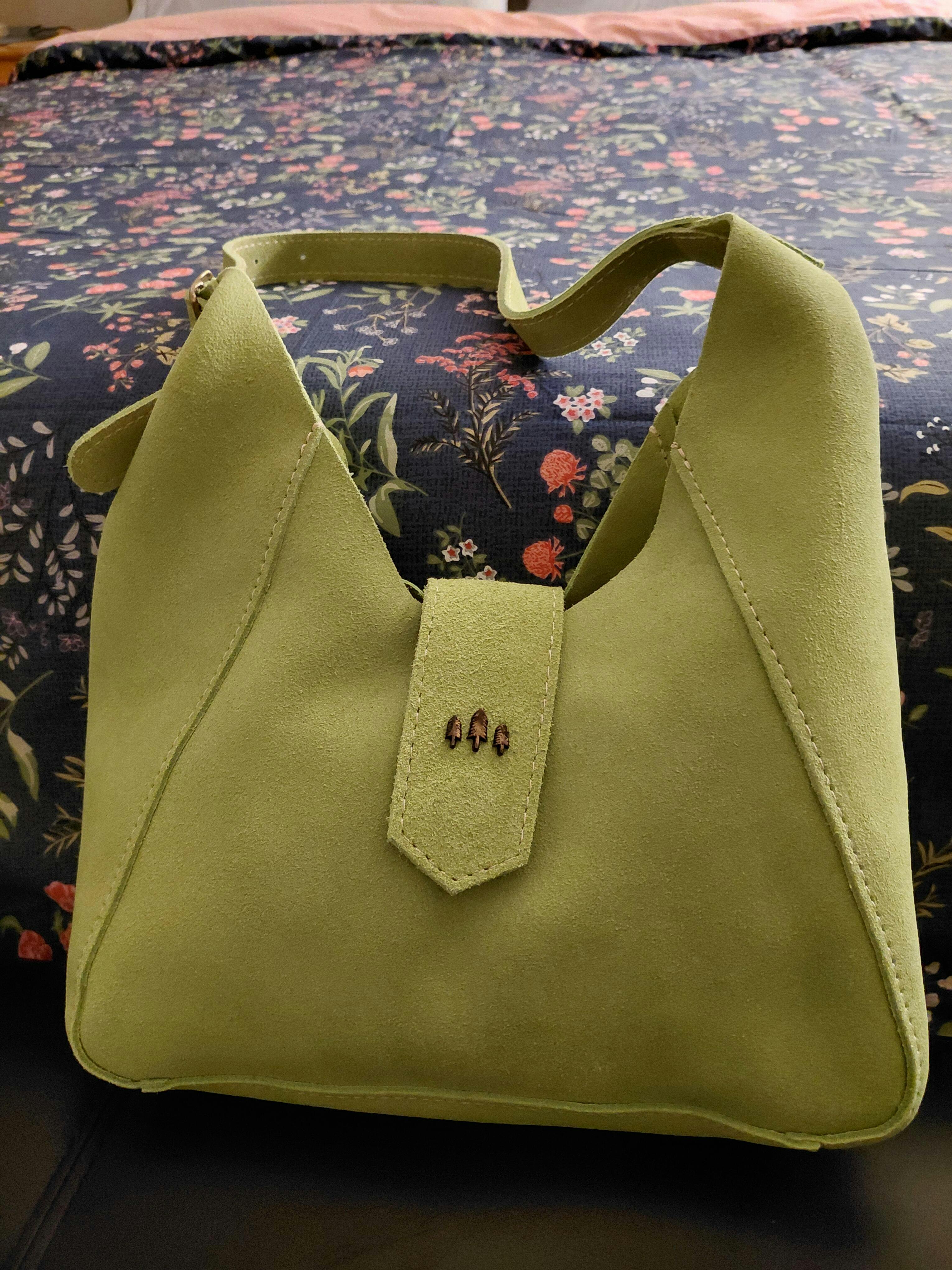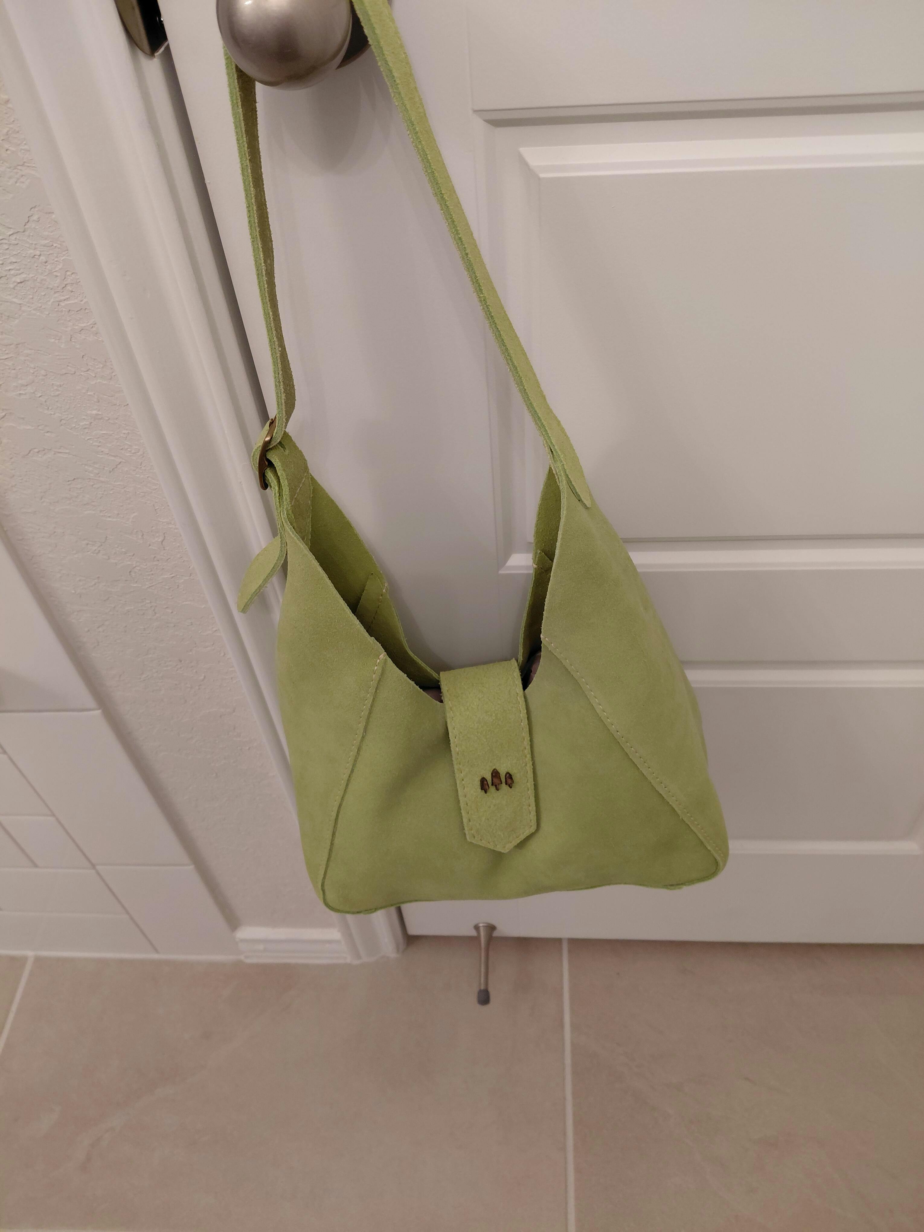I adore this Lime Flora! It was one of three bags I got as my first PLG purchase, and it is by far my favorite (though I love them all). This bag is definitely large enough for everything I typically carry, and it’s a chic and clever design. I see it as primarily a bag for Spring on into Summer. It's the perfect pop of color against a white linen tee. It doesn’t slip off my shoulder - I guess because it's suede? I do plan to treat the suede because I want this girl to last.