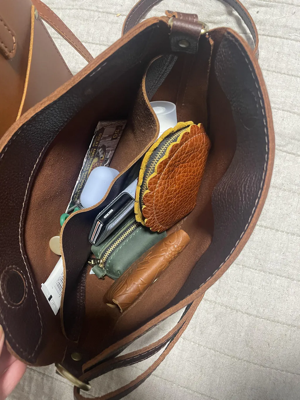 Smells lovely, super sturdy and, more importantly, holds my large Hobo wallet.