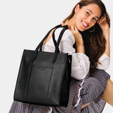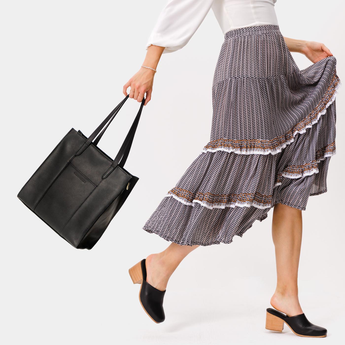 Black*North/South | Model holding structured large tote bag with overlapping panels and crossbody strap
