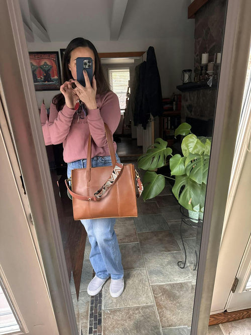 This is my first PLG. I wanted a structured tote with the ability to wear it crossbody for church. It's classy and stunning. The cognac color looks great with all colors.