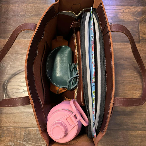 Purchased the large zippered Lola in Cognac for my daughter. She wanted a professional tote to carry her wristlet wallet, water bottle, small lunch bag, small essentials pouch, iPad mini, and light sweater. I also added a matching tassel for a little flair. She loves the color, and is very happy with the size.