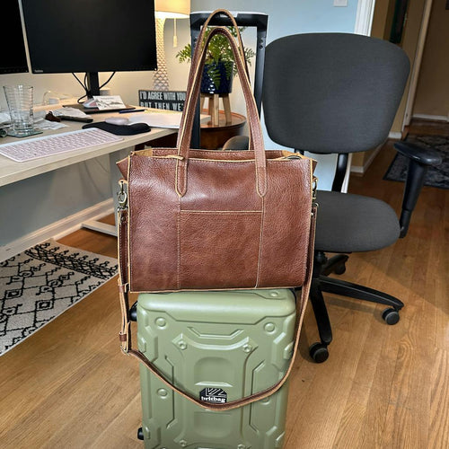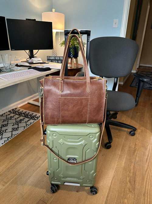 I have been looking for a work bag for awhile, and I’ve been eyeing the Large Lola Crossbody- but wasn’t sure it would fit my PC AND my cords plus other stuff that I usually carry in a backpack. I finally went for it and I am in love!!! My PC fits perfectly (13”x 9” Thinkpad) plus 2 Sushi Rolls, small Monaco purse, folder, and eyeglass case - AND it zips with all of this inside. My East/West Lola color is Asheville… such a gorgeous squishy leather. And even tho it’s squishy, this bag is still stiff enough to get my stuff in and out quickly at the airport. And bonus? The handles are just the right length to allow for pulling a carryon suitcase with my Lola sitting on top. 😍