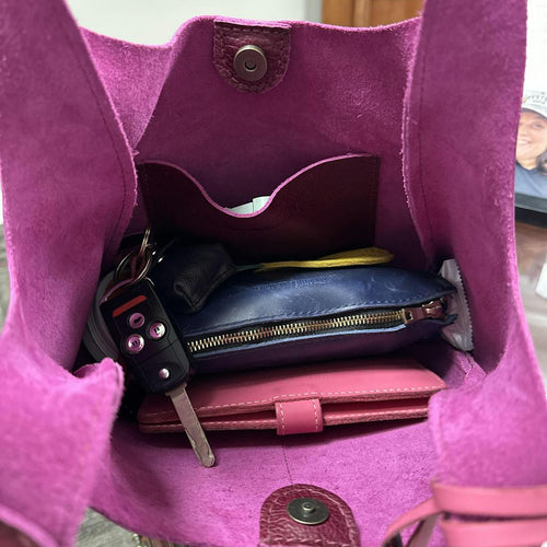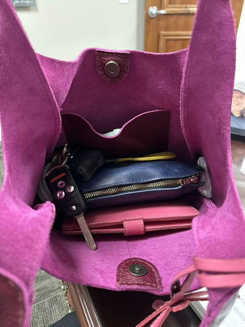Our durable leather goods are unlined, featuring the natural suede side of the hide. Since fabric-lined bags inevitably discolor and tear with use, we chose to showcase the soft sueded underside of our hides, ensuring that your bag lasts a lifetime.