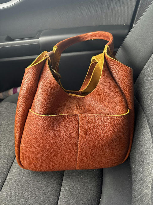 I love the Madison bag! She is absolutely perfect. While I usually prefer a crossbody bag for hand free convenience, I practically gasped when I saw her picture on the coming soon post! 2 outside pockets, 1 inside pocket and lots of room for my wallet and a few littles to keep it organized and easy to use. The leather is soft but structured enough to not flop in and irritate me when I'm trying to pull out my wallet. I absolutely love the Chili-Red color as well, honestly I love this bag.