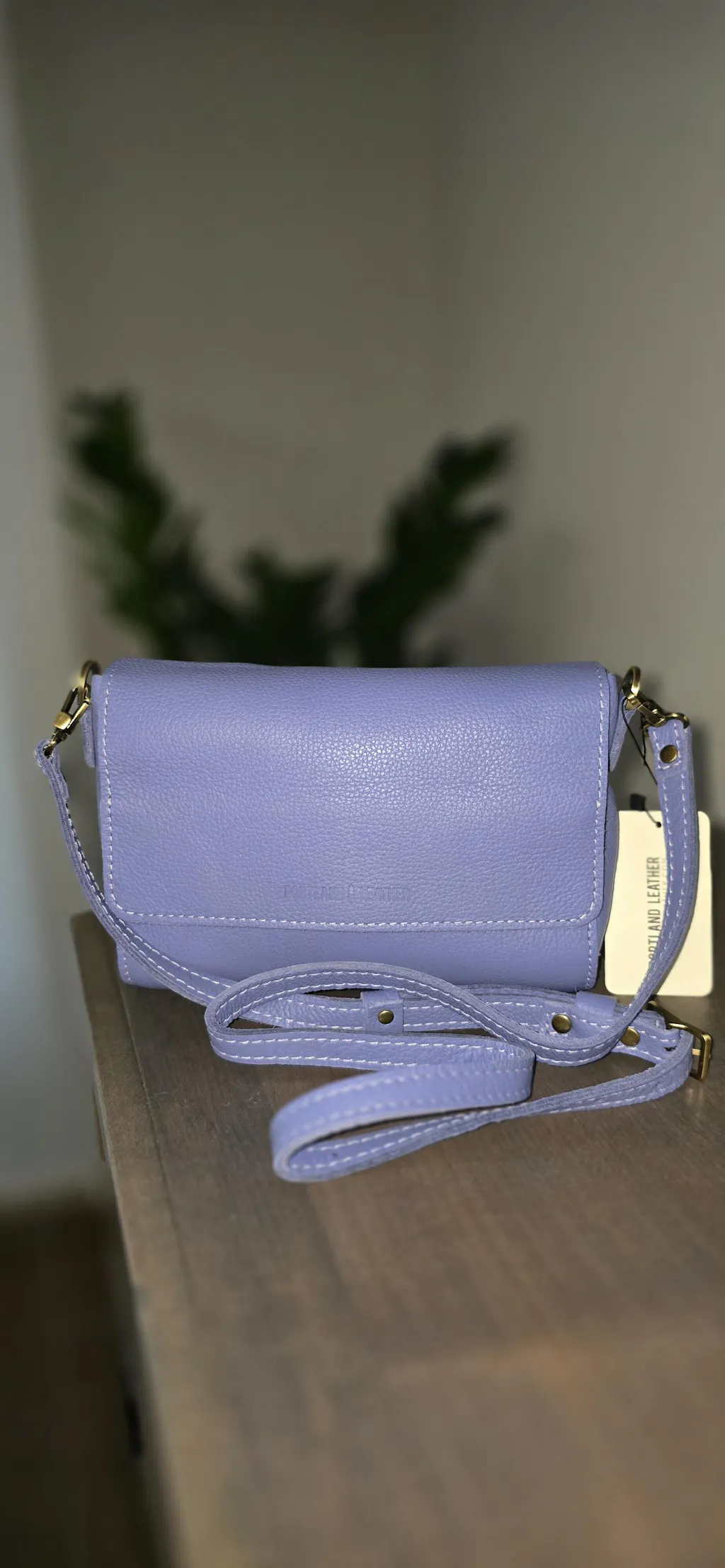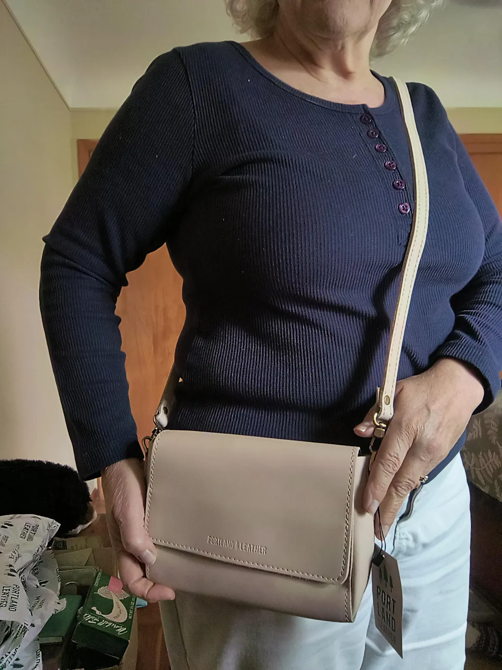I got the grizzly color mini crossbody with the mini Daisy wallet. They match perfectly and I love the color. The bag can hold a phone, wallet, and a few more small, miscellaneous items or a small tissue packet, for example. It also has this great little pouch on the inside that I found perfectly holds flat bills. I didn’t know I needed that! It’s light, and it’s the perfect size for what I need. The raw leather on the inside is a luxurious touch because it feels like a handmade item. The magnetic closure is sufficient, and the strap is long enough to use it as a crossbody, as advertised.