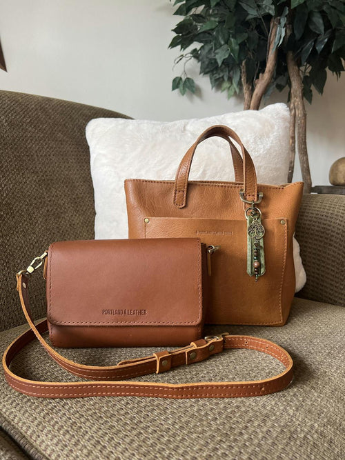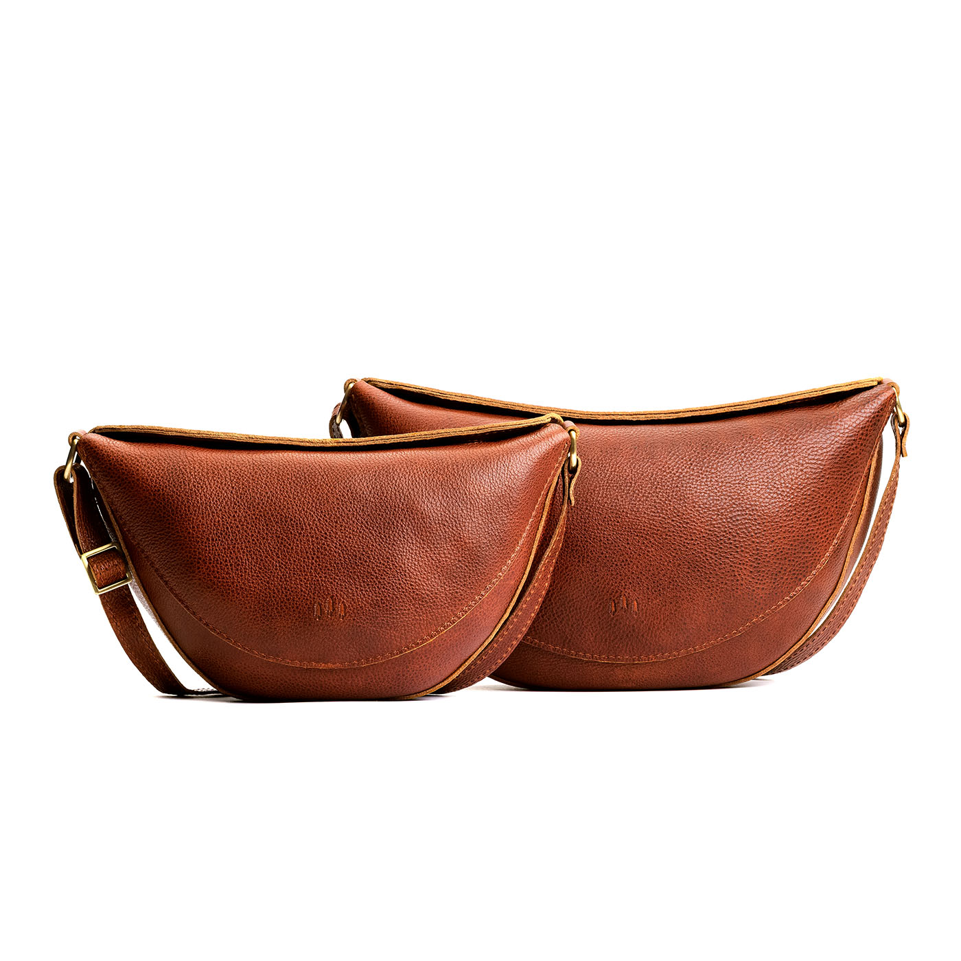 Chestnut | Side by side of both sizes of leather crossbody bag with magnetic messenger bag closure