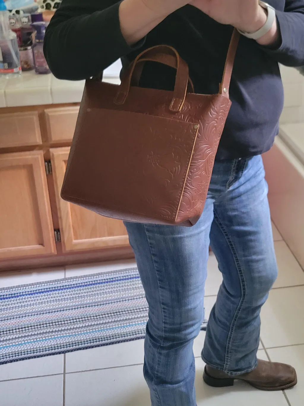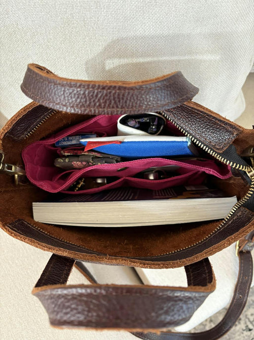 I was hesitant to buy a Mini crossbody Tote because I thought it would be too small for all the things that I carry. I was pleasantly surprised to find that it holds everything that I carry in my Medium tote! The zippered nutmeg is so pretty but also very durable and I know it will hold up to anything I can throw at it. I’m so happy I took a chance on the mini!