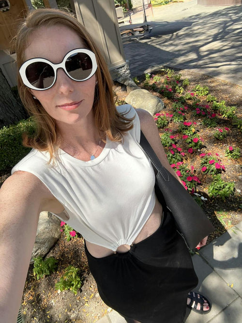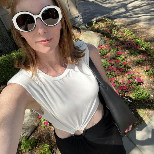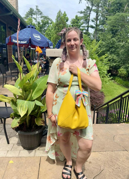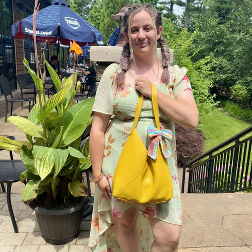 Coldbrew*Small | Model wearing petite shoulder bag with adjustable strap and magnetic snap closure
