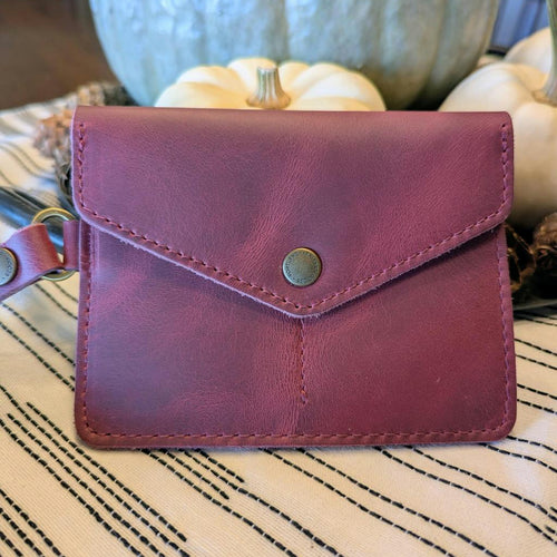 I like to use this Passport Wristlet as a small wallet for certain bags or as a wristlet when going into a store where I don't need my larger bag. I have a few colors... Anemone is the newest and I love the matte finish and marbling effect on this dry leather. I would describe as a deep raspberry wine color... a nice compliment inside a Merlot bag. Fits a passport and ID and cards nicely as well.