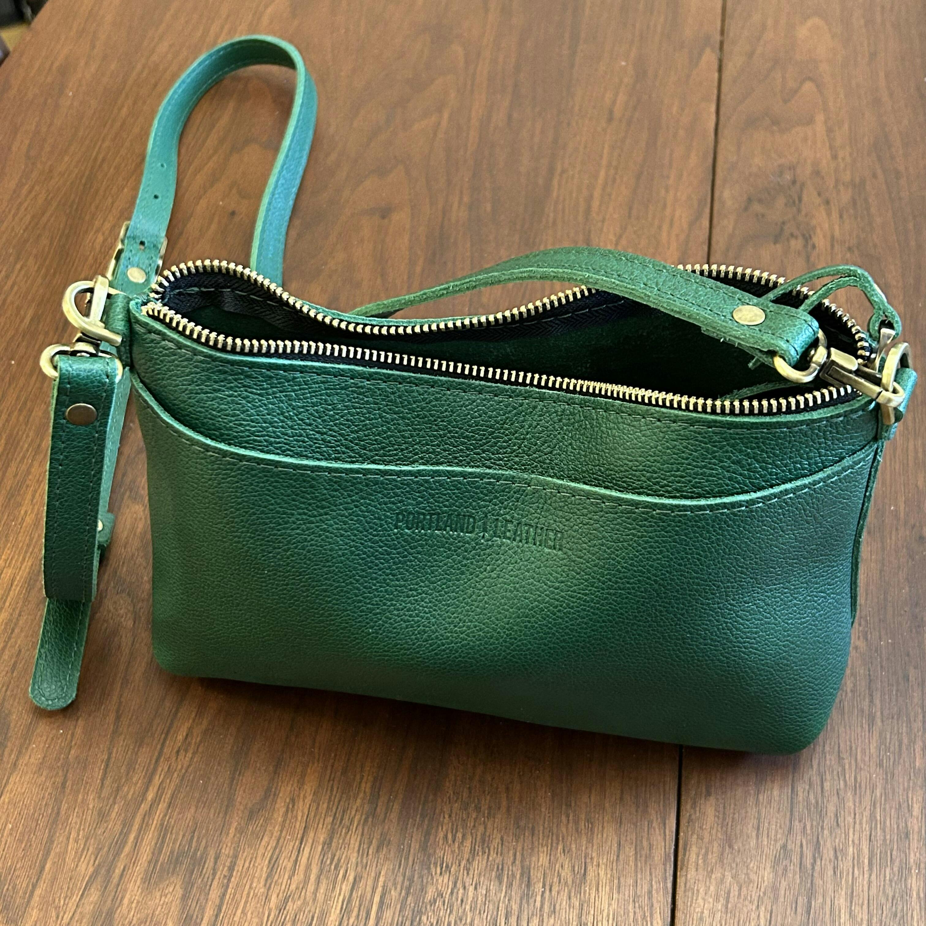 First of all, Portland Leather Goods customer service was wonderful and promptly resolved an issue when I received an improperly graded bag. The color Bacalar is a gorgeous, deeply saturated green—kind of in between teal and pine. The simple and classic shape works perfectly with any outfit, and the crossbody strap is really flattering. It’s a slim design but large enough for my bifold wallet, mini Luna pouch, cell phone, and keys with room to spare. I love it.