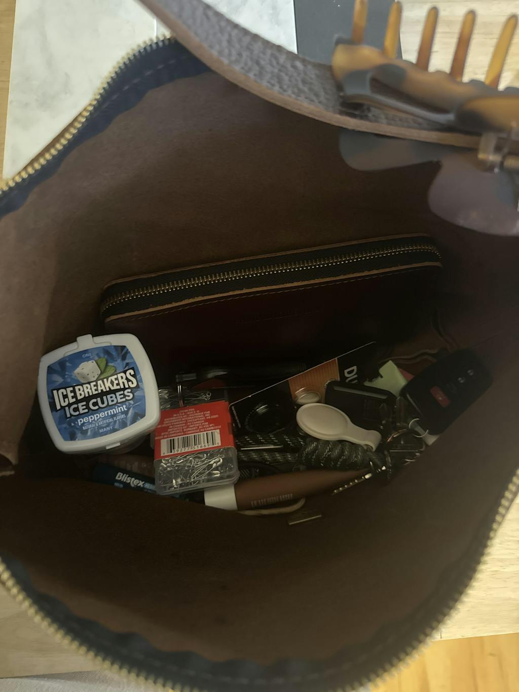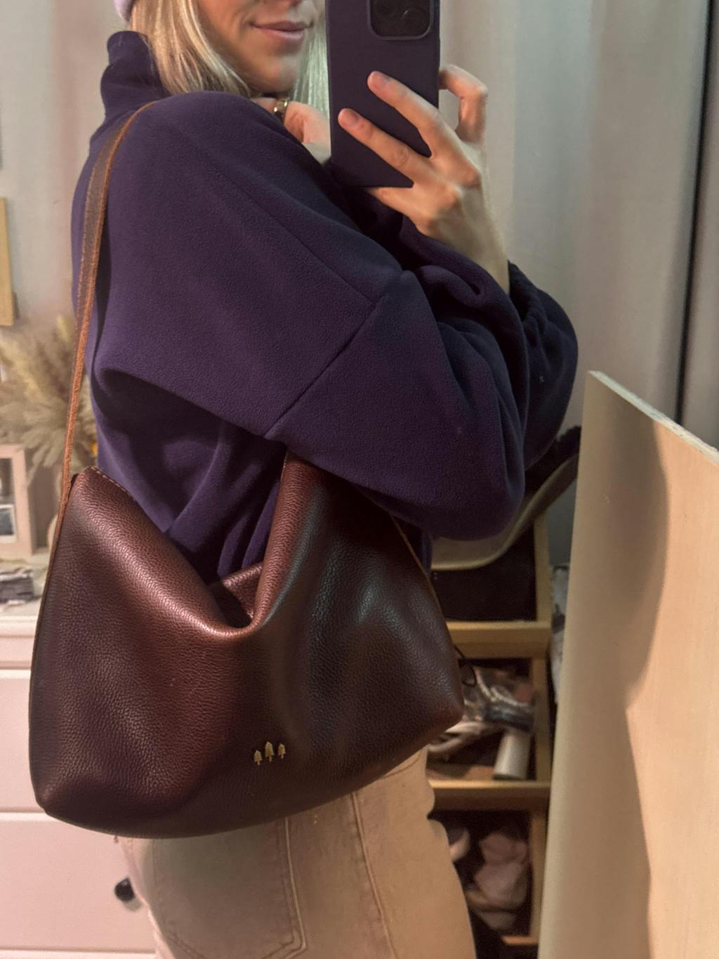 Love my Nutmeg Small Slouchy. Perfect size for all my essentials and love pebbled slouchy leathers! The only thing that would make it better is an inside pocket in the back for a phone.