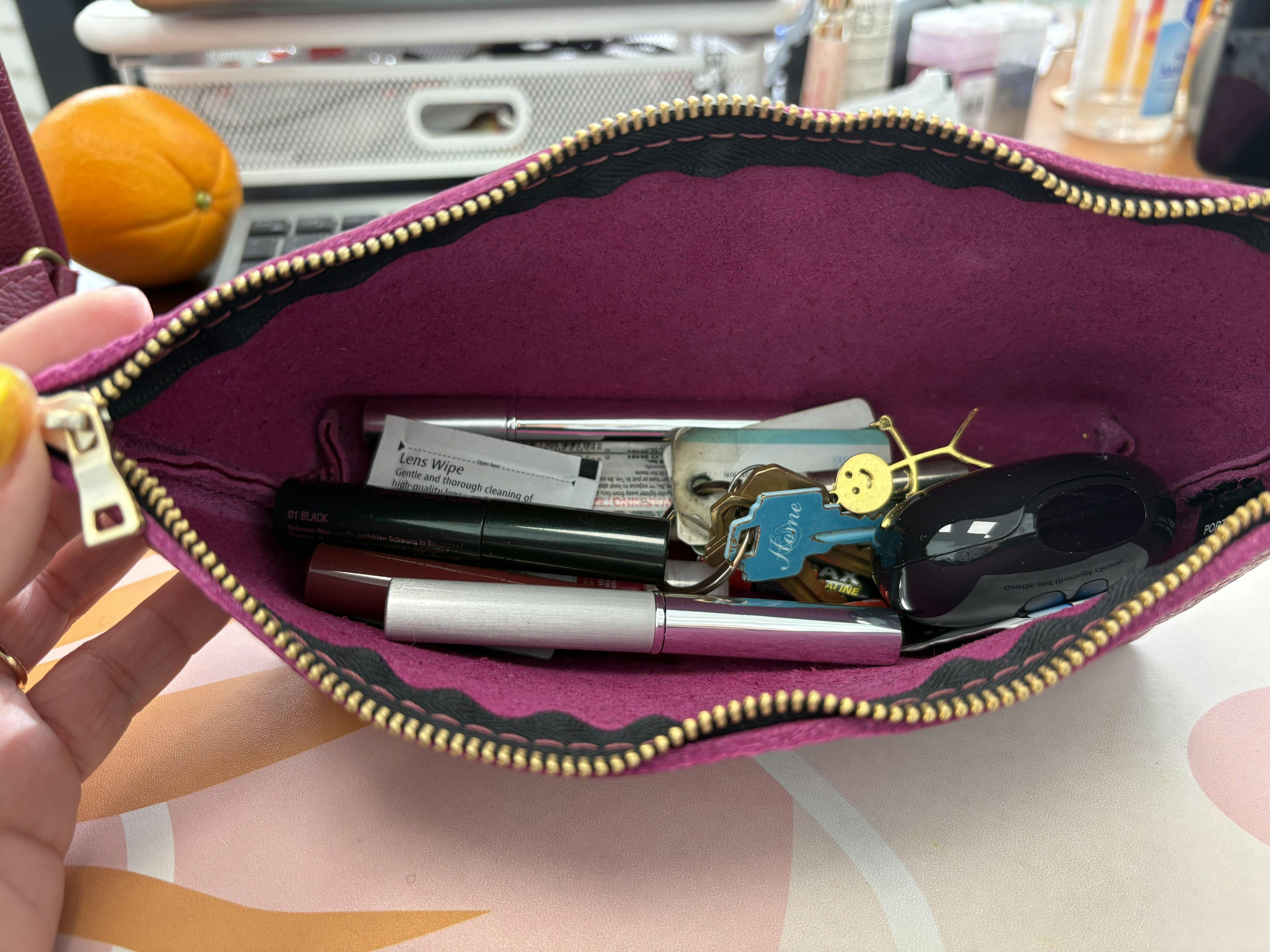I hate losing stuff in the bottom of my bag. This fits everything that would just run around loose and cause me anxiety. I zips up nicely and holds soooo much stuff!! Love the color (orchid) too!!