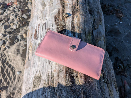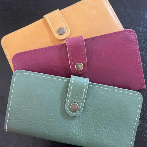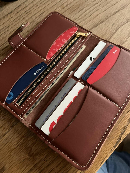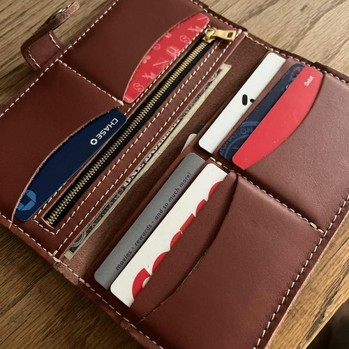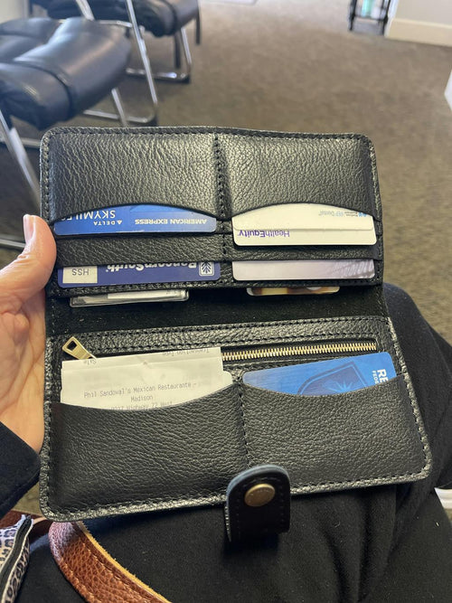 • Features a secure snap closure with 8 card slots and a zippered interior pocket